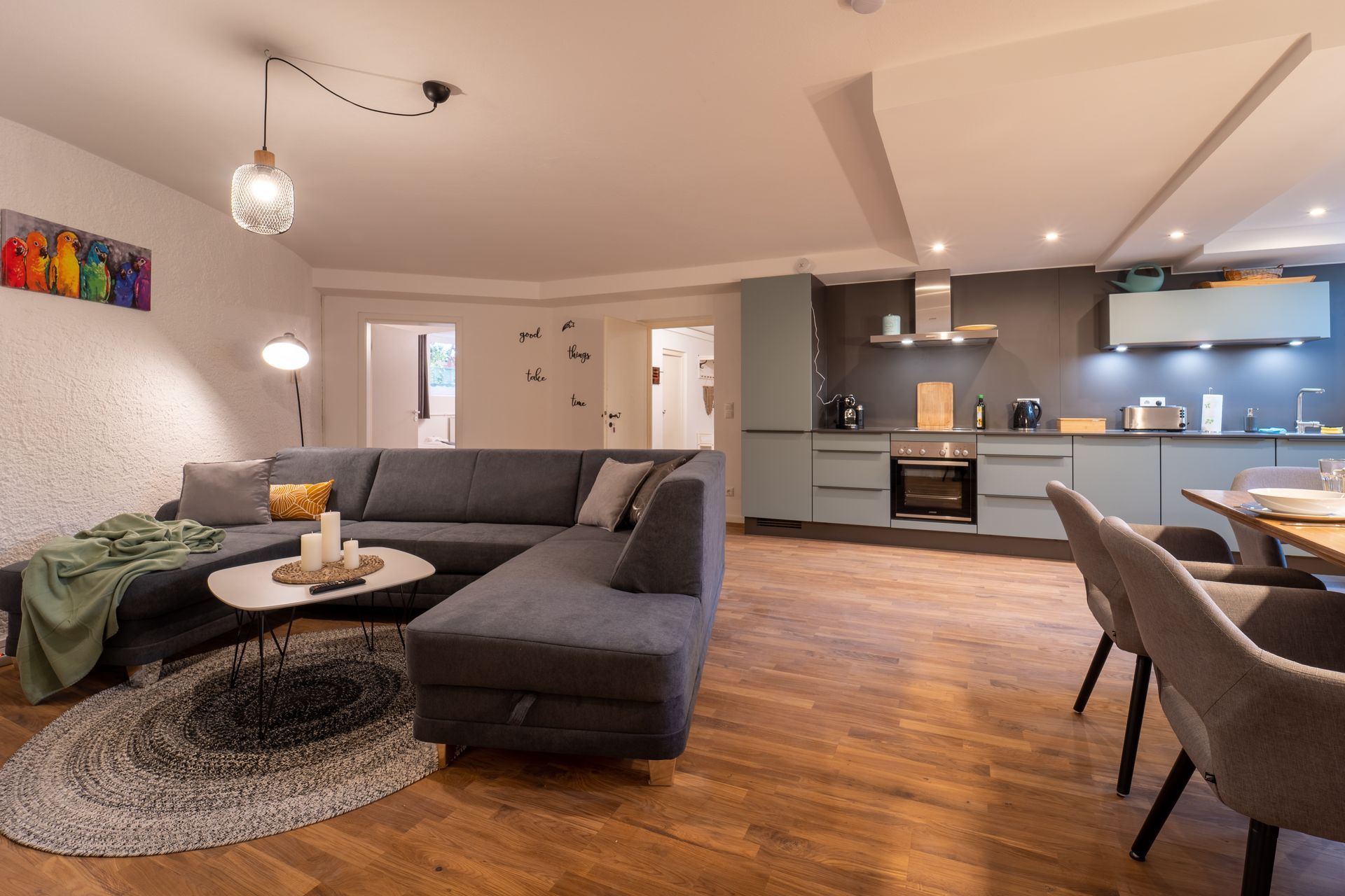 Die gemütliche Wohnlandschaft in der Nähe der Küche lädt zu langen Abenden mit schönen Gesprächen ein. Oder du setzt dich mit deinen Liebsten an den großen Esstisch, um gemeinsam zu essen und Spiele zu spielen.